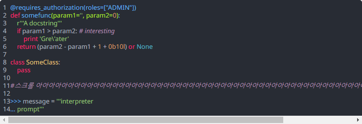 기본 티스토리 코드 블록에서는 코드가 한 줄로 너무 길어지면 줄 바꿈을 해서 보여줍니다. 이 설정은 코드를 한눈에 볼 때는 편할 수 있지만, 코드의 전체 구조가 흐트러져 보기 불편할 때도 있습니다. 스크롤 바를 추가해서 티스토리 코드블록 줄바꿈을 없애고 코드가 옆으로 길어질 때 스크롤바를 움직여서 보게 할 수 있습니다. 스크롤바를 추가하면 위와 같이 보입니다.