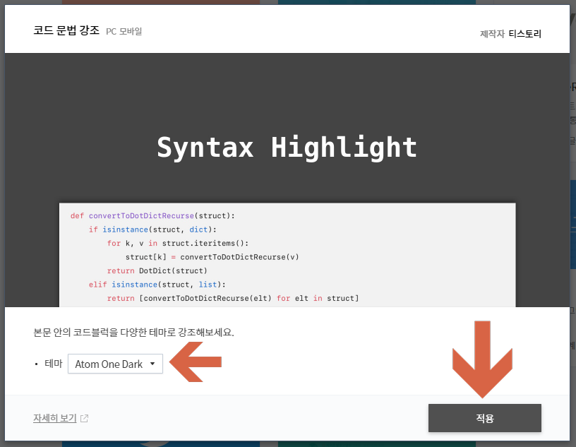 참고 자료 : [TISTORY/Code Block] 티스토리 코드 블록 하이라이트(highlight.js) 테마 설정