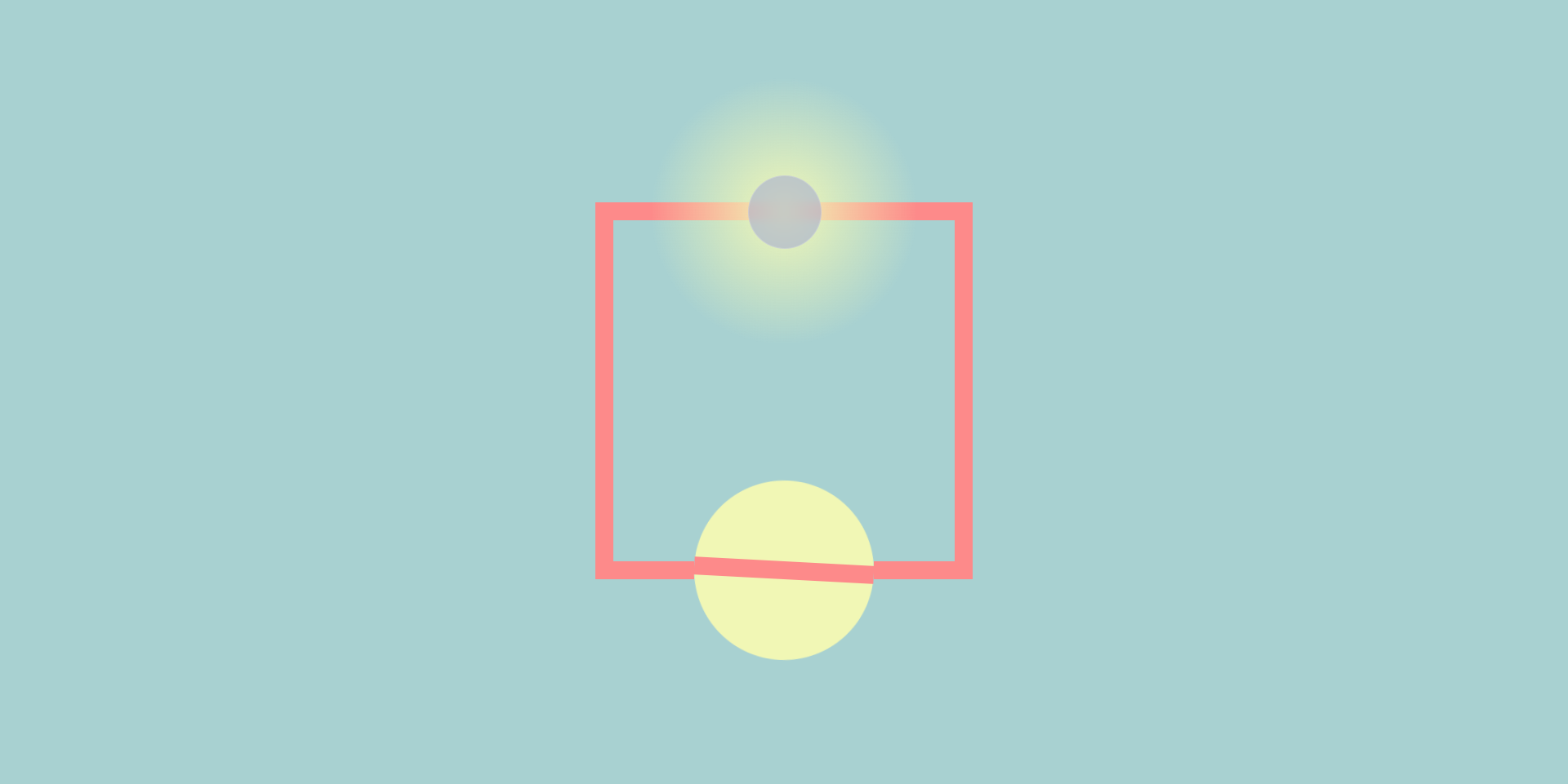아래 노란색 원에 마우스를 올려 놓으면 돌아간다. 계속 돌아가다 빨간색 선이 연결이 되면 위쪽의 불이 켜지게 된다. 다시 노란색 원을 돌려 빨간 선이 어긋나면 불이 꺼지게 된다.