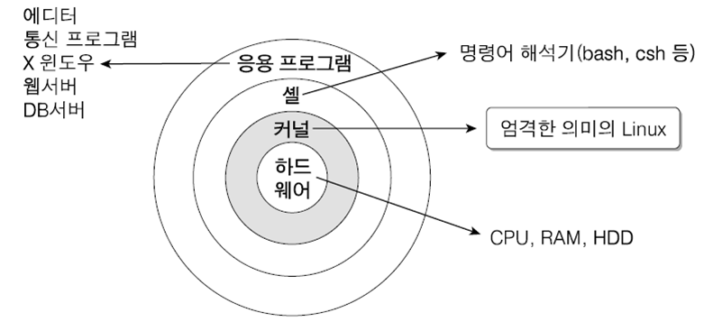 - 셸 (shell) : 명령어 해석해 커널에 전달 (bash, csh)