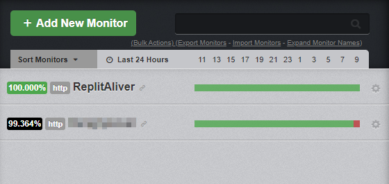 그러면 다음같이 아까 입력한 이름의 모니터가 추가됐음을 볼 수 있습니다. 이제 해당 repl은 24시간 끊임없이 돌아가게 됩니다.