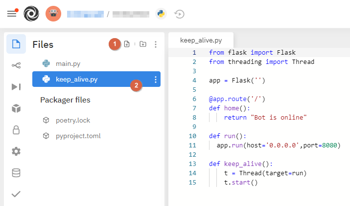 위의 그림처럼 1번을 눌러 keep_alive.py 파일을 하나 만들어줍니다. 그리고 아래 코드를 복사해 붙여 넣어줍니다.