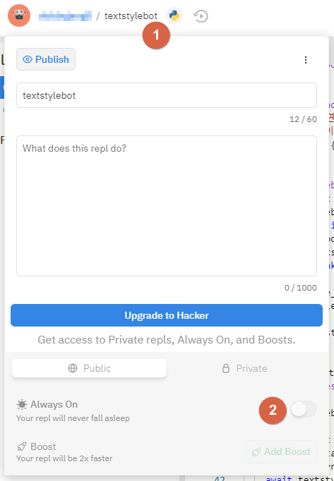 repl명(프로젝트명)을 클릭했을 때 나오는 메뉴 아래의 Always On을 클릭할 수 있게 바뀝니다. 이를 눌러 항상 repl이 켜져 있게 만들 수 있습니다. Always On은 5달러 결제 시 5개의 repl에 적용할 수 있습니다.