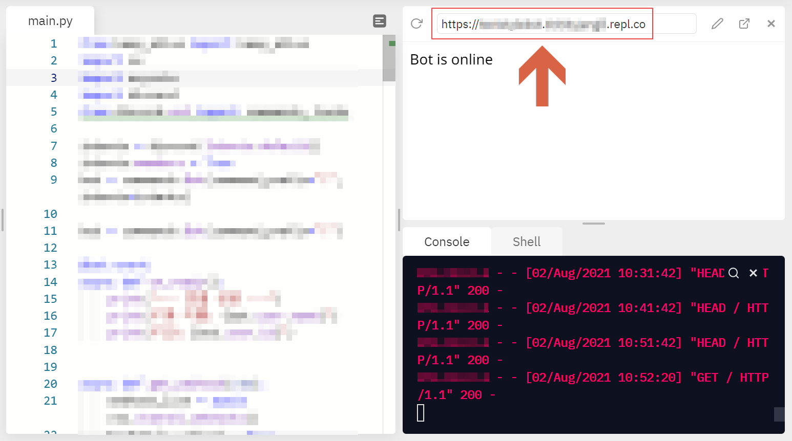 위 코드는 파이썬의 웹 프레임워크인 Flask를 이용하여 웹 사이트를 만들고, 그 사이트 안에 "Bot is Online"이라는 문구를 띄우게 하는 코드입니다. 이 웹사이트가 열려있는 동안에는 해당 repl이 꺼지지 않게 됩니다.