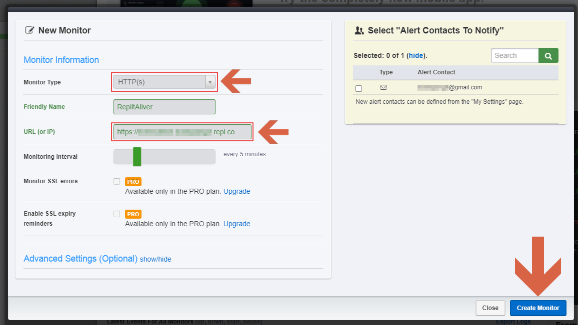 창이 뜨면 Monitor Type은 HTTP(s)로, URL은 아까 복사했던 url 주소를 넣어주세요. Friendly Name은 원하는 대로 입력해주시면 됩니다. 다 입력하셨으면 왼쪽 아래의 Create Monitor를 눌러 마무리해주세요.