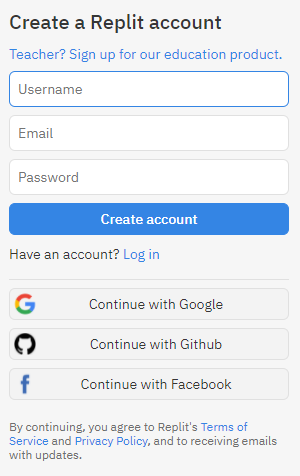 우선 리플릿 사이트에 들어가 로그인해줍시다. 로그인은 구글 계정, 깃허브 계정, 페이스북 계정으로도 가능합니다.