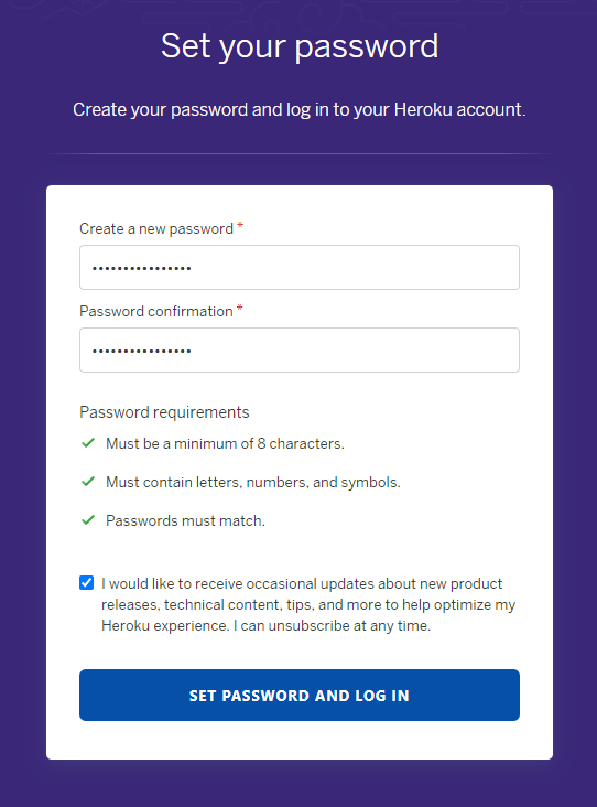 이제 다음과 같이 비밀번호 입력을 하는 창이 뜹니다. 8자 이상의 비밀번호를 글자, 숫자, 기호를 섞어서 입력해주시고 Set password and log in을 클릭해주세요.