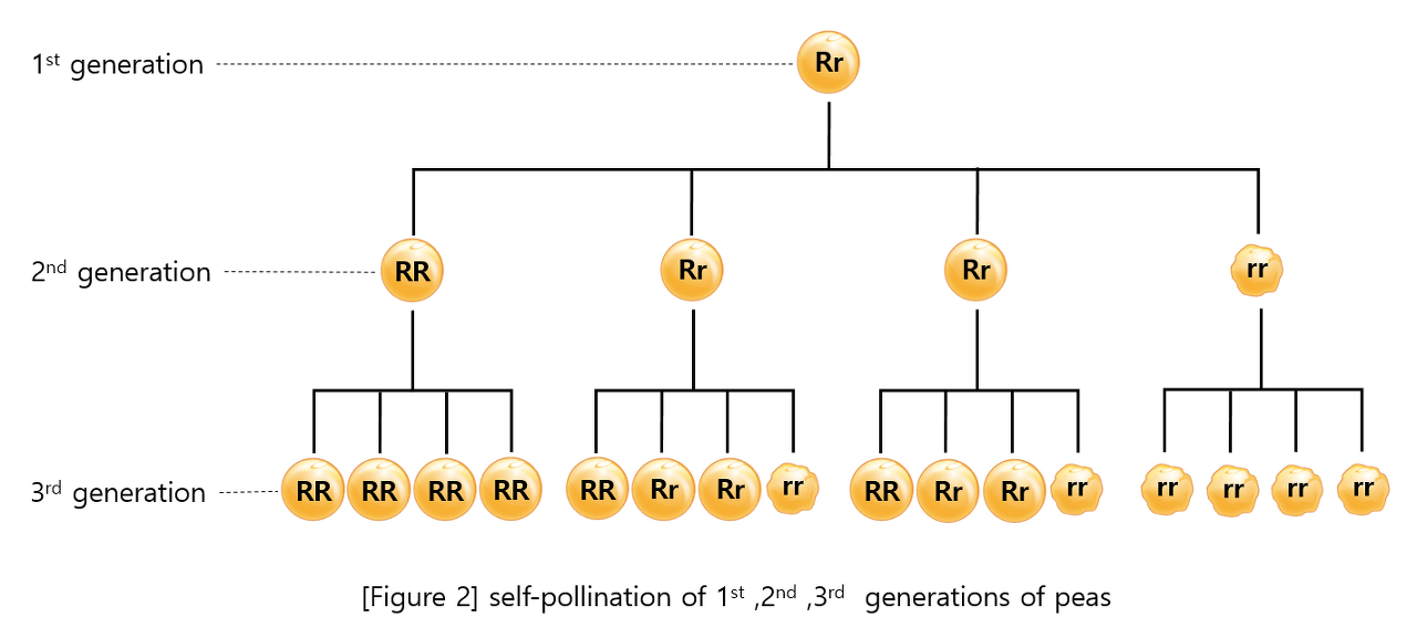 잡종 완두콩(Rr) 1대부터 시작한 가계도로 그려보면 그림 2와 같습니다.