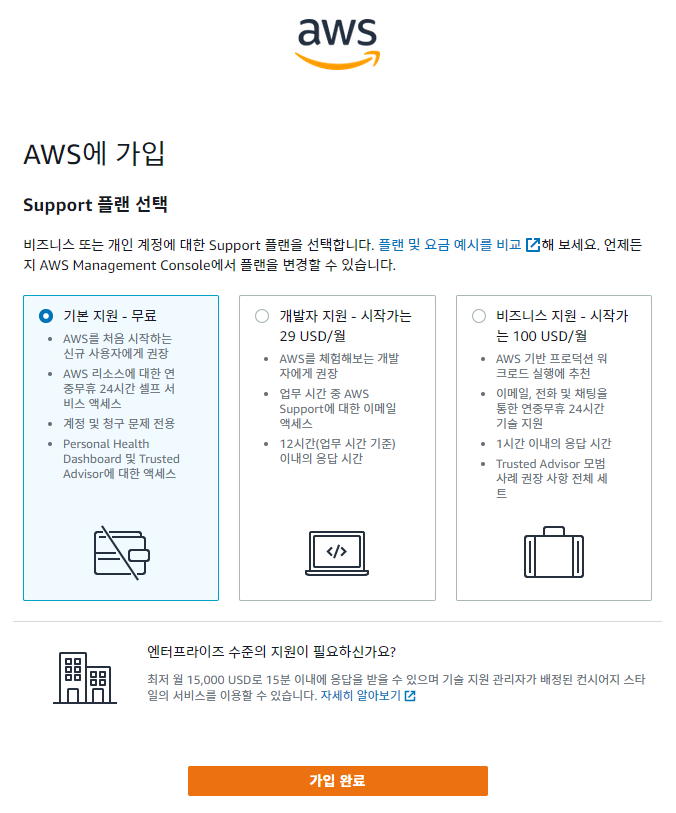 AWS를 어떻게 사용할 것인지를 정합니다. 고르는 것에 따라 월별 이용료가 달라집니다. 무료로 이용하시려면 가장 왼쪽을 선택해주세요. 그리고 가입 완료 버튼을 누르면