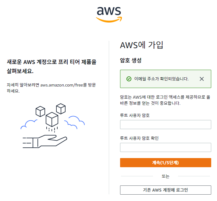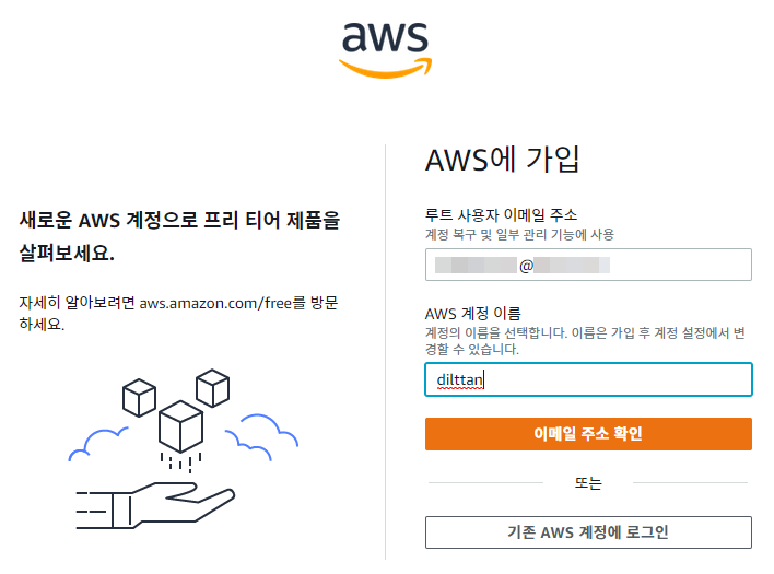 보통 회원가입처럼 이메일과 계정 이름을 입력합니다. 나중에 로그인 할 때 해당 이메일로 접속하게 됩니다. 다 입력을 하셨으면 이메일 주소 확인을 눌러줍시다.