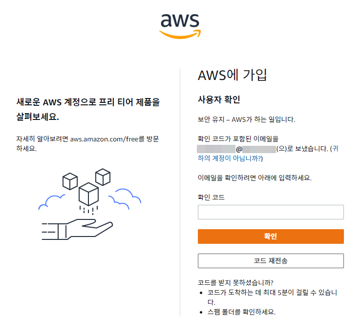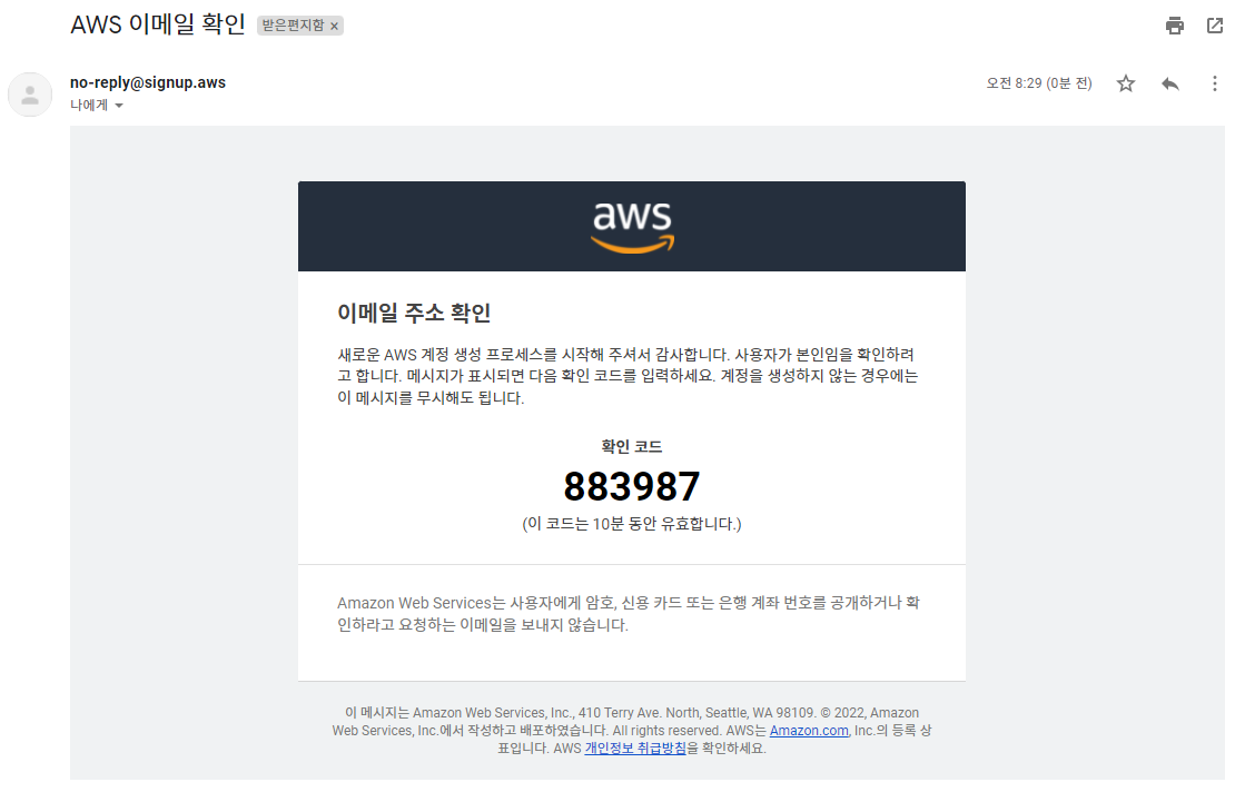 그럼 AWS에서 해당 이메일로 확인코드 메일을 보내게 됩니다.