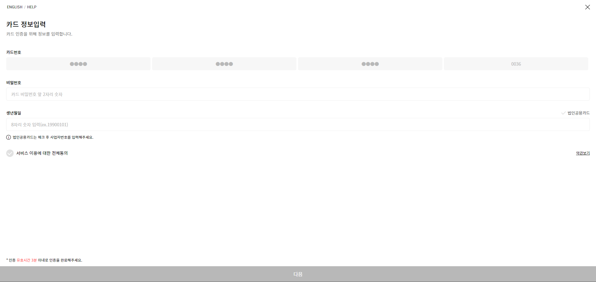 카드 정보입력을 하면 은행사에 따라 비밀번호 등을 추가로 입력하라 뜰 수 있습니다.
