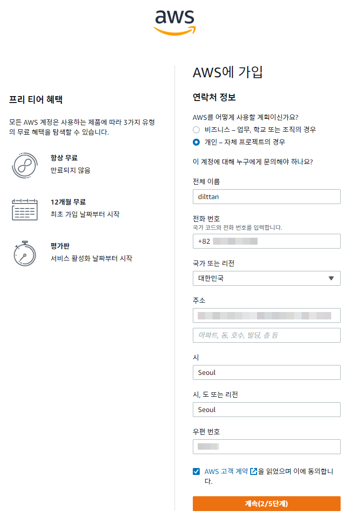 전화번호, 주소와 같은 세부 정보를 입력합니다. 주소는 영문주소 변환을 참고하시면 됩니다. 전화번호는 앞에 국가코드 +82를 붙여주셔야 됩니다.