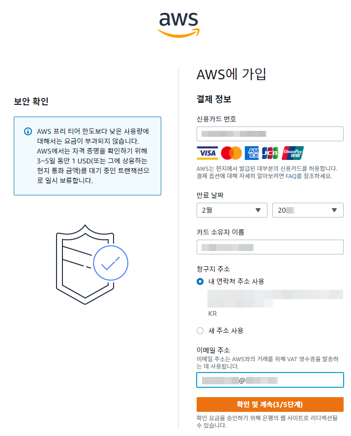 AWS는 아마존 웹 서비스의 약자로 아마존에서 제공하는 클라우드 컴퓨팅 서비스입니다. 이를 이용하여 자신이 원하는 프로그램을 24시간 돌릴 수 있지요. 이번 시간에는 AWS에 가입하는 방법에 대해 알아봅시다. AWS 가입은 총 5단계로 이루어져 있습니다!